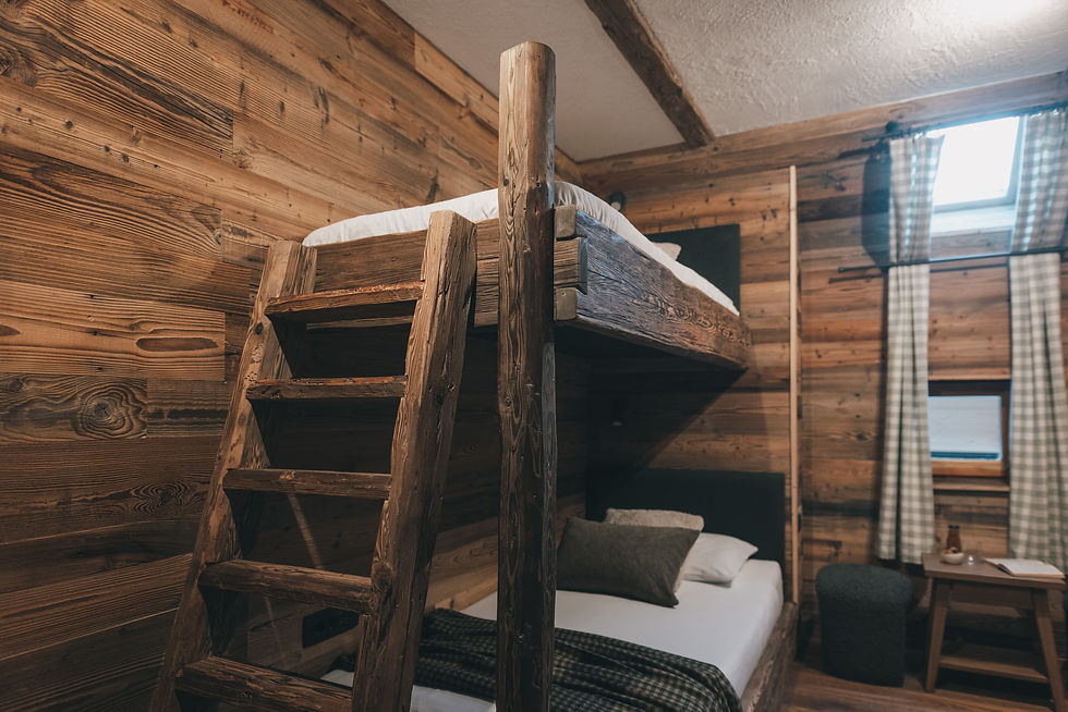 An Alpine-style room for one to two guests with a private bathroom and bunk beds, located on the first floor. The room is furnished in a pleasant Alpine rustic style. Elevator access to the first floor is also provided.